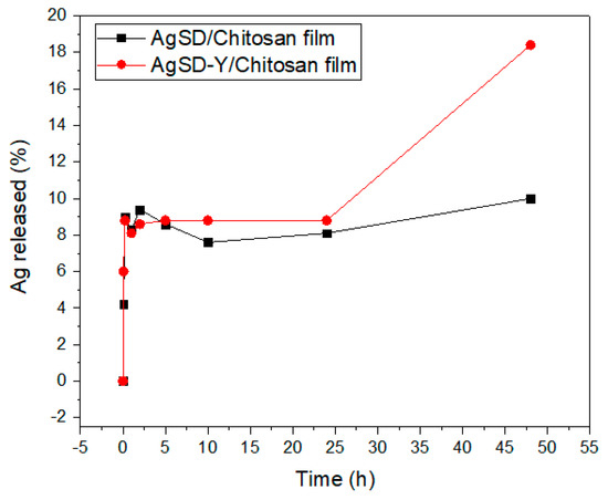 To evaluate the release profile of AgSD from chitosan films, a simulated exudate fluid (SEF, 142 mmol/L sodium ions and 2.5 mmol/L calcium ions) representing the salt concentrations observed in wound fluids was used as a medium and serum at a controlled temperature of 37 °C. Release tests were performed using 4 × 4 cm film samples (average mass 0.15 g). Erlenmeyer flasks with the film samples and 100 mL of SEF solution were placed on an orbital shaker (Fisherbrand™, Fisher Scientific, Waltham, MA, USA) and kept under constant stirring throughout the assay to decrease the risk of mass convection resistance. Aliquots of 1.5 mL were taken at predetermined times over a total test time of 48 h. The analysis was performed in duplicate and the silver released was analyzed by atomic absorption spectroscopy (AA SpectrAA 50B, Varian, Palo Alto, CA, USA) using a hollow cathode lamp (λ = 328 nm) and a mixture of air and acetylene generated the flame.