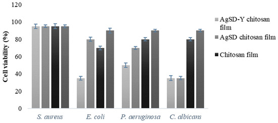 Antimicrobial activity analyses against common human pathogens, namely, Escherichia coli (ATCC 8739), Staphylococcus aureus (ATCC 6538), Pseudomonas aeruginosa (ATCC 9027) and Candida albicans (ATCC 10231), were carried out with the AgSD-loaded films. The strains were standardized using the technique of series dilution. Analyses were carried out by the inoculation of 106 CFU/mL of each strain in individual tubes containing 30 mL of TSB medium for the bacteria or 30 mL SDB medium for the yeast. The samples of films were cut into dimensions of 6 × 6 cm, and the sterilization were performed with UV light for 15 min each side. All sterilized samples were incubated in sterile test tubes. For the positive control, each tube was incubated with the microorganism only, whereas for the negative control, the test tubes contained only TSB or SDB medium. The tubes were incubated at 37 °C for 12 h. Aliquots of 100 µL were transferred to flat-bottomed microplates. The microbiological growth was monitored by reading the optical density by an automatic microplate reader (Synergy HT Biotek, Winooski, VT, USA) at a wavelength of 620 nm.