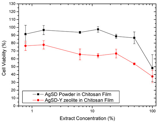 Figure 14 shows the effect of concentration of the extract obtained from the films on the inhibition of fibroblast growth. The extract containing AgSD-zeolite showed a higher capacity to inhibit the growth of fibroblasts. For this film, up to the extract concentration of 25%, the cell viability was just over 60%, considering the standard deviation, these values can be at best close to 70%, which would be the minimum acceptable value for viability cell so that the material is not considered cytotoxic [20]. For the extract containing AgSD, the cell viability was above 70% except for undiluted extract (concentration of 100%). Therefore, both extracts without dilution (concentration of 100%) inhibited the growth of fibroblasts at levels that are considered cytotoxic.