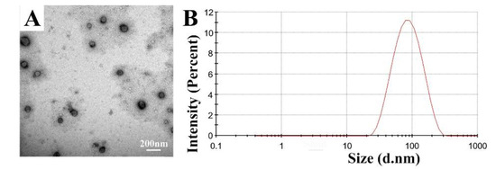 As described above, IPC-DNVs were stable for 15 days. The particle sizes were 82.55 ± 3.85 nm with a narrow size distribution indicated by PDI < 0.200. The entrapment efficiency and deformability index of IPC-DNVs were 79.29% ± 2.41% and 38.25 ± 1.38 g/cm2/s (n = 3) before lyophilization, respectively [29]. TEM micrographs of IPC-DNVs confirmed their spherical shape and whorl-like structure (Figure 2A). Figure 2B shows IPC-DNVs have a narrow particle size distribution.