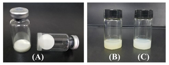 Appearance of lyophilized 8%-L-T, as well as the appearance of reconstituted 8%-L-T. (A) lyophilized IPC-DNVs (8%-L-T), (B) IPC-DNVs, (C) reconstituted 8%-L-T.