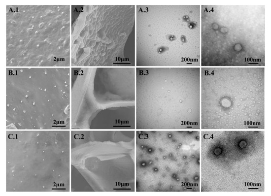 Micrographs of lyophilized and reconstituted samples. (A) 8%-T, (B) 8%-L, and (C) 8%-L-T, 1 and 2 are SEM images, 1 morphology at low magnification and 2 morphology at high magnification, 3 and 4 are TEM images, 3 micro-structure at low magnification and 4 refers to micro-structure at high magnification.