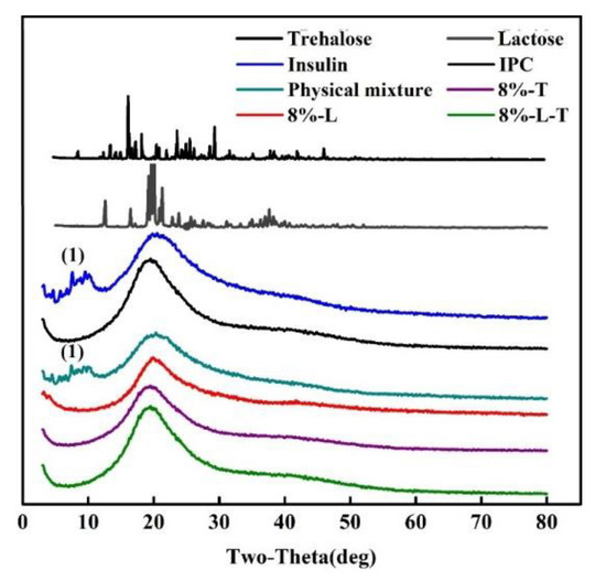 For lyophilized samples, monitoring of crystallinity was important. From the XRD results, we found that the integrity of the insulin-phospholipid complex (IPC) was well protected. No crystal formed after freeze-drying. In contrast, samples were all in the amorphous state, which might be the main reason why IPC was in a good state. Crystals can damage IPC through mechanical stresses, causing the insulin to drop out, it could also result in loss of close contact between sugar and phospholipid so the IPC cannot be well fixed on the nanovesicles. Hence, crystallization needs to be avoided during freeze-drying. Another vital indicator is Tg, which can be used for the selection of the best storage temperature. The storage temperature should be maintained below the Tg of the samples. From the DSC result, 8%-L-T had the highest Tg among the three, which might contribute to the high Tg of trehalose.
