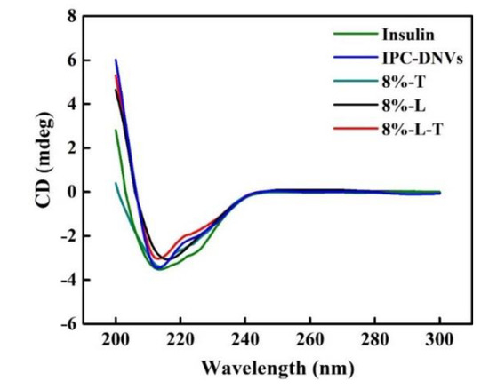 The CD spectra showed insulin, IPC-DNVs, 8%-L-T, and 8%-T have two minima at 208 and 223 nm, which is a typical α-helix structure. This is in close agreement with the spectra obtained by others [33,34]. However, the CD spectra of 8%-L were smooth and had no minima at 208 and 222 nm. For 8%-L, the α-helix ratio of insulin increased to 35.9%, which indicated that the secondary structure of insulin had changed, providing a negative result. The θ208/θ223 ratio of 8%-L was 2.30, indicating that the structure of insulin had tightened. For 8%-T, the α-helix ratio of insulin was 24.1%, and the θ208/θ223 ratio was 1.42. The θ208/θ223 ratio of insulin in 8%-L-T was 1.61, which is similar to that of insulin in solution. The lyophilized state of deformable nanovesicles can appropriately maintain the secondary structure of insulin.