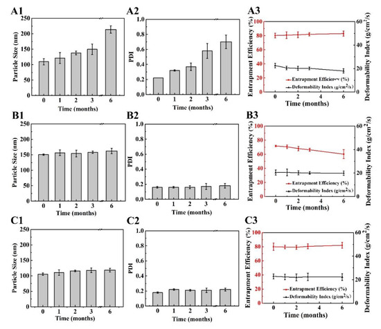 Changes in lyophilized deformable nanovesicles after storage at 25 °C for a period of 6 months. (A) 8%-T, (B) 8%-L, and (C) 8%-L-T, 1 particle size, 2 PDI, 3 entrapment efficiency (EE) and deformability index (DI).