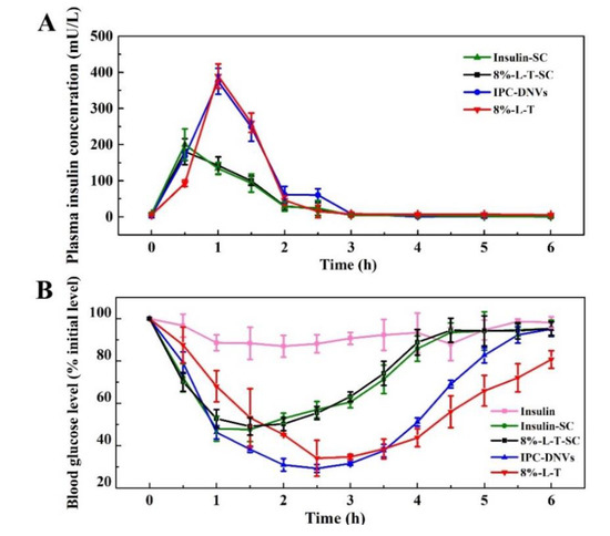 Figure 9A shows the plasma insulin concentration after subcutaneous administration of insulin (insulin-SC) and 8%-L-T (8%-L-T-SC) and buccal administration of IPC-DNVs and 8%-L-T. To identify the bioavailability of lyophilized deformable nanovesicles, 8%-L-T-SC was subcutaneously administrated. 8%-L-T-SC had the same hypoglycemic properties as insulin-SC, which meant insulin could be quickly released from the nanovesicles. IPC-DNVs and 8%-L-T have the same pharmacokinetics characteristics. The peak plasma (serum) concentrations of IPC-DNVs and 8%-L-T were attained at 1 h and had the same height. Table 7 summarizes the AUC and Fr of the four groups. Compared with the subcutaneous administration of insulin solution, the Fr of IPC-DNVs and 8%-L-T were 18.27% and 17.45%, respectively. The freeze-drying process appeared to have no effect on the bioavailability of 8%-L-T.