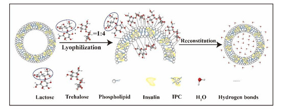 Lactose is a reducing sugar and can exist in both chain and ring forms [41,42]. Its chain form easily forms internal hydrogen bonds, so fewer groups of lactose are available to form hydrogen bonds with deformable nanovesicles (or phospholipids). These weak interactions between lactose and phospholipids cannot protect against the structural disruption that occurs during phase transition, so the complex may struggle to re-encapsulating nanovesicles during the freeze-drying and reconstitution processes. Therefore, the entrapment efficiency of deformable nanovesicles tends to decrease. The reducing groups of lactose can react with the amine groups of insulin to form an N-substituted glycosylamine, which is a cascade of reactions (Maillard reaction) [43], so their direct contact with insulin should be prevented. However, lactose can form a strong physical matrix that provides a physical barrier to inter nanovesicle contact, potentially related to its chain form which tends to be more rigid. This would prevent nanovesicles from fusion and aggregation. Therefore, lactose may have good cake-supporting properties to reduce mechanical damage on deformable nanovesicles, which explains why lactose can help IPC-DNVs maintain their long-term stability.
