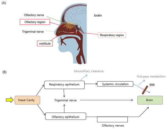 Nasal cavity can be divided into three regions, which are the nasal vestibule, the olfactory, and the respiratory regions (Figure 1A). The vestibular region is located immediately at the nostril openings [40]. The absorption of drugs in this region is the least important among three regions due to the small surface area (approximately 0.6 cm2) and the non-cilliated epithelium of the cell surface. Respiratory region occupies the largest part of the nasal cavity and the respiratory epithelium covering the respiratory region has the large surface area (~130 cm2) due to the presence of cells that possess numerous microvilli. This large surface area, combined with the high density of blood vessels, makes the respiratory region the major site of drug absorption into the systemic circulation if drugs are able to pass through the mucus layer to reach the surface of the epithelium. Respiratory region is also innervated by the trigeminal nerves, which extends from the brain stem and appear to be a potential target nerve for transporting drugs to the CNS [3].