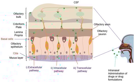 The olfactory region is located in the deep upper part of the nasal cavity under the cribriform plate, the horizontal bone separating the nasal cavity from the brain. Cribriform plate has high perforations that provide access for the nerve endings to enter and, hence, constitute the unique part of the CNS that directly connects to the outside environment [5,43]. Olfactory epithelium consists of three types of cells, namely the basal cells, supporting cells, and the olfactory neural cells. Olfactory neurons extend from the olfactory bulb in the brain to the apical surface of the olfactory epithelium, with their cilia extending towards the nasal cavity (Figure 1A). The olfactory region in humans occupies 2~12.5 cm2 [2], corresponding to the 1.25~10% of the total surface area of the nasal cavity. Drugs passage from the nose to the brain through the olfactory epithelium might occur by diverse pathways, which will be reviewed in the next section.