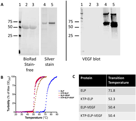 ELP, KTP–ELP, ELP–VEGF, and KTP–ELP–VEGF proteins were electrophoresed using SDS-PAGE (4%–20%) Stain-FreeTM gels (Bio-Rad, Hercules, CA, USA). After electrophoresis, one of two identical gels was imaged by Bio-Rad stain-free imaging or processed for silver staining (Pierce), and the second gel was used for Western blotting. The proteins were transferred to a nitrocellulose membrane using 1-Step transfer buffer (Thermo Scientific, Rockford, IL, USA) with a Pierce G2 Fast Blotter (Thermo Scientific, Rockford, IL, USA). Following the transfer, the membrane was blocked with 5% dry milk in PBS-T for 1 h at room temperature. At the end of the incubation, the membrane was probed with anti-VEGF (A20) antibody (Santa Cruz, SC 152) at 1:200 dilution overnight at 4° C. Following incubation, the membrane was washed with PBS-T. After the wash, the membrane was incubated with goat anti-rabbit poly-HRP antibody (Pierce) at a 1:10,000 dilution for 1 h at room temperature. Following the incubation, the membrane was washed with PBS-T, incubated with SuperSignal West Femto substrate (ThermoFisher, Waltham, MA, USA), and the bands were visualized using chemiluminescence. Blot imaging was performed using the Bio-Rad Universal Hood Gel Doc System.