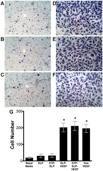 ELP-fused VEGF constructs stimulate endothelial migration. Human glomerular microvascular endothelial cells were plated in the top chamber of Matrigel-coated Boyden chambers in basal media and basal media plus saline (A) or 100 nM ELP (B), KTP–ELP (C), ELP–VEGF (D), KTP–ELP–VEGF (E), or free VEGF (F) was placed in the lower chamber. (G). Sixteen to eighteen hours after plating, the lower surface of the membrane was stained with crystal violet, and the number of cells per field were averaged over six identical fields for each treatment group. The experiment was repeated three times. * Statistically significant increase relative to unstimulated cells (one-way ANOVA with post-hoc Tukey’s multiple comparison).