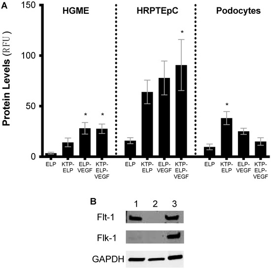 In vitro cellular binding/uptake of all constructs in primary human renal cells. Primary human glomerular microvascular endothelial cells (HGME), proximal tubule epithelial cells (HRPTEpC), and podocytes were exposed to each fluorescently labeled ELP fusion protein at 10 µM for 24 h. Protein levels bound to or in each cell type were determined by flow cytometry (A). Expression of the VEGF receptors Flt-1 and Flk-1 were determined in each cell line by Western blot ((B). Lane 1—HGME, Lane 2—HRPTEpC, and Lane 3—podocytes). * Statistically significant increase relative to ELP-treated cells (one-way ANOVA performed within each cell type with post-hoc Tukey’s multiple comparison).