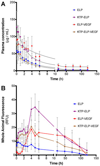 3.4. Pharmacokinetics and Biodistribution of ELP, KTP–ELP, ELP–VEGF, and KTP–ELP–VEGF