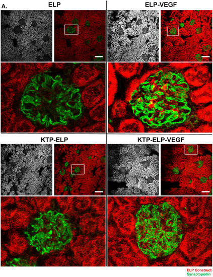 Intra-renal distribution of constructs. Localization of each polypeptide in the kidneys was determined by direct detection of its rhodamine label. The grayscale section shows ELP, KTP–ELP, ELP–VEGF, or KTP–ELP–VEGF localization in each section. Slices were co-stained with synaptopodin ((A), green) to mark podocytes or CD31 ((B), green) to mark endothelial cells. A saline-injected animal, with no primary antibody used in the staining, was used to determine autofluorescence levels in the red and green channels ((B), bottom panel). Scale bar = 100 μm.