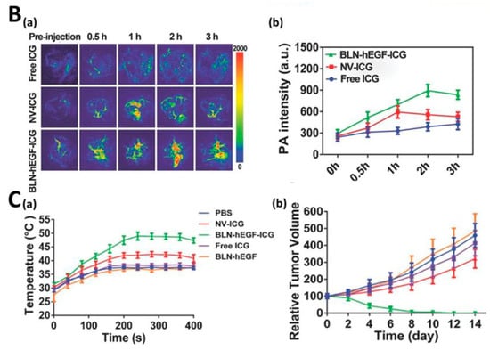 Biofunctionalized liposome-like nanovesicle (BLN) for active cellular targeting. (A) General scheme. (a) Plasmids containing ligands for targeted cell-surface marker protein human epidermal growth factor (hEGF) were genetically engineered and then transfected into the cells to express the modified targeting ligands on the cell surface. (b) Expressed protein ligands were further transported to the Golgi body via a signal peptide-mediated protein trafficking route. (c) Transport vesicles carrying ligands from the Golgi body fused with the plasma membrane, thus presenting targeting proteins on the cellular surface. (d) With sodium deoxycholate entrapped in the plasma membrane bilayer, ligand-presenting giant plasma membrane vesicles begin to bud from the cell surface in a manner similar to the secretion process of exosomes. (e) After incubation of giant plasma membrane vesicles with drugs and surfactants, ultrasonic vibration encapsulates the drug indocyanine green (ICG) into uniform nanoscaled BLNs. (f) Drug-loaded BLN-hEGF exhibit ligand-mediated affinity to EGF receptors on the tumor surface. (B) In vivo photoacoustic (PA) images (a) and average PA intensity (b) of nude mice with MDA-MB-468 tumors after intravenous administration of BLN–hEGF–ICG, nanovesicles without targeting ligands (NV-ICG), or free ICG (Free-ICG) at time points indicated. Image intensities are shown in color scale on the right. (C) Increasing temperature profiles (a) of the tumor regions 2 h after intravenous administration of different formulations under 808 nm laser irradiation (1 W cm−2 for 10 min). Relative tumor volume changes (b) in different treatment groups after phototherapy. Figure reproduced from [43] with permission from WILEY-VCH, 2017.