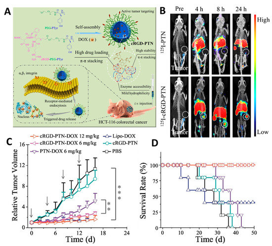 Polymeric NPs, which include self-assembled structures and dendrimers, have also been successfully exploited in NMDD for active cellular targeting for cancer (Table A1) [47,48,49,50,51,52,53,54,55]. This is primarily due to the availability of a wide variety of synthetic polymers and polymer precursors with ample chemical functionalities (such as carboxylate, amine, alkyne) for conjugations, self-assembly and physicochemical features (such a sensitivity to light, pH). NPs prepared with such polymers can be loaded with hydrophilic as well as hydrophobic drugs and conjugated to targeting moieties. Recently, DOX-loaded polytyrosine (PTN) NPs decorated with cyclized RGD peptide (cRGD-PTN-DOX) were prepared to treat colorectal cancer in vivo (Figure 2A) [48]. This preparation afforded ~3-fold better accumulation in HCT-116 tumors in mice via interaction with integrin ανβ3 compared to non-targeted NPs (Figure 2B), with over 5-fold better tolerance and improved toxicity (~6-fold lower half-maximal inhibitory concentration, IC50) compared with clinically used DOXIL®. Intravenously administrated cRGD-PTN-DOX-induced effective inhibition of HCT-116 colorectal tumor with depleting side effects (Figure 2C). The authors stated the release of the DOX at targeted cells was due to degradation of polytyrosine by proteinase K. One very desirable feature of polymeric NPs is their controllable degradation and drug release once in the intracellular environment. However, the design of such NPs requires hybrid approaches for efficient cellular internalization followed by the triggered release of drugs via intracellular (such as pH, redox, hypoxia, enzyme activities) [56,57,58,59,60,61,62,63,64,65,66] and extracellular (such as light, temperature, sound, magnetic forces) [67,68] stimulations. Liu et al. recently reported the synthesis of pH-responsive (pH 6.5) NPs consisting of poly(L-histidine) (PHIS) and an anti-tumor immune regulator resiquimod (R848) [64]. These NPs were additionally decorated with CD44-targeted hyaluronic acid (HA) and conjugated with DOX via a pH-labile hydrazone linker. Investigation with different CD44 expressing cell lines (MCF-7, 4T1) and 4T1 tumor-bearing mice suggested that deprotonation of PHIS around pH 6.5 (a pH value close to that of the tumor microenvironment) switched the nature of NPs from hydrophobic to hydrophilic. This triggered the release of R848 to exert immunoregulatory action followed by the rupture of the hydrazone linkage-bound DOX at pH ~5.5 (pH of endo/lysosomes) for accelerated release of DOX. While intracellular stimulation of drug release is versatile, the triggered release via extracellular stimulation can often offer a better degree of control over spatiotemporal drug release [13,69]. For example, Nguyen and colleagues reported methotrexate (MTX)-loaded polymeric NPs for SSTR-mediated targeted delivery [70]. These NPs were decorated with lanreotide (LT), a synthetic analog of somatostatin, on the surface of the NPs comprised of a photosensitizing polymer, polyaniline (PANI), poly(lactic-co-glycolic acid) (PLGA), and DSPE-PEG. This preparation showed a 2-fold greater uptake into SSTR-positive human breast adenocarcinoma MDA-MB-231 cells in BALB/c nude mice compared to non-targeted counterparts. When coupled with near-infrared (NIR), the heat-assisted burst release of MTX resulted in remarkably enhanced antitumor activity. For improved penetration and accumulation to the tumor, stimuli-responsive targeted NP constructs have been additionally functionalized with extra features such shrinkable size and vasodilation [71,72,73]. For instance, Hu and colleagues prepared DOX and ICG-conjugated dendrimer NPs decorated with enhanced tumor targeting and penetration capabilities [71]. These NPs were assembled with nitrooxyacetic acid (a NO donor as a vasodilator) and conjugated with HA for enhanced permeability. These NPs showed the ability to shrink in size from ~330 nm to ~35−60 nm via hyaluronidase degradation and had enhanced uptake when coupled with tumor internalization RGD (iRGD) peptide. This formulation showed 4.5-fold longer blood retention with 2.1-fold increased accumulation in the tumor at 36 h post-injection. Administration of this formulation in 4T1 tumor-bearing mice, followed by 808 nm laser irradiation resulted in complete ablation of the tumor via chemo- and photothermal effects.