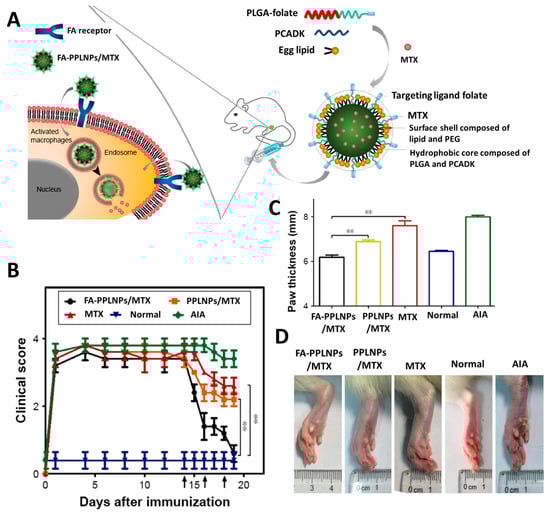 Polymeric NP for active cellular targeted delivery of methotrexate (MTX) to rheumatoid arthritis. (A) Structure and mechanism of cellular uptake of methotrexate-loaded folic acid–polyethylene glycol–poly(lactic-co-glycolic acid)–poly(cyclohexane-1,4-diylacetone dimethylene ketal)–lipid NP (FA-PPLNPs/MTX). NPs were composed of egg lipids, polyethylene glycol (PEG)–poly(lactic-co-glycolic acid) (PLGA) forming a hydrophilic shell, FA around the hydrophilic shell as a targeting ligand, and poly(cyclohexane-1,4-diylacetone dimethylene ketal) (PCADK) and PLGA as a hydrophobic core. (B–D) Therapeutic efficacy of targeted FA-PPLNPs/MTX, non-targeted PPLNPs/MTX, and free MTX in adjuvant-induced arthritis (AIA) rats. Clinical scores (B) of rheumatoid arthritis as a function of days after induction (arrows, FA-PPLNPs/MTX, PPLNPs/MTX, free MTX, or saline), paw thickness (C) after all treatments, measured with caliper, Photograph (D) of AIA rat paws from the different groups. Values are mean ± SD (n = 5, ** p < 0.01). Figure reproduced from Ref. [102] © DOVE Medical Press.