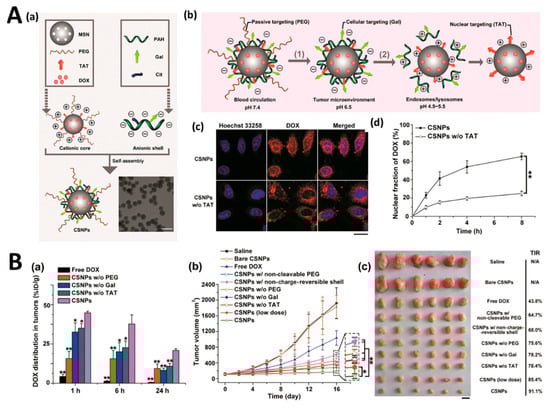 A core-shell silica NPs (CSNPs) for nuclear-targeted delivery of DOX to cancer cells. (A) Schematic illustrations showing the construction of CSNPs and their triple-stage targeting capability. (a) CSNPs were constructed via the electrostatic adsorption of negatively charged poly(allylamine hydrochloride)-citraconic anhydride (Gal-PAH-Cit) onto positively charged PEG-MSN-TAT. Scale bar in TEM image represents 100 nm. (b) Illustration of the triple-stage targeted delivery process, including the PEG-mediated passive targeting in the circulating blood (pH 7.4), Gal-mediated cellular targeting following PEG cleavage in tumor microenvironment (pH 6.5), and TAT peptide-mediated nuclear targeting after charge reversal in endosomes/lysosomes (pH 5.0). (c) Nuclear transport of CSNPs in QGY-7703 cells. Fluorescence images revealing the internalization of CSNPs (red, emanating from DOX) and controls CSNPs (without TAT modification) into the Hoechst 33258-labeled nuclei (blue) at 8 h postincubation. Pink fluorescence represented the overlapped signal of red and blue fluorescence. Bar refers to 20 μm. (d) The distributing percentage of internalized CSNPs in the nuclei following incubation at pH 6.5 for different times (n = 3). ** p < 0.01. (B) In vivo tumorous distribution and therapeutic effect of CSNPs and control preparations to H-22 tumor-bearing mice. (a) In vivo distribution of DOX in tumors at 1, 6, and 24 h postadministration (n = 3). * p < 0.05, ** p < 0.01 vs CSNPs. (b) The changes in tumor volume (n = 6). * p < 0.05, ** p < 0.01. (c) The photograph and tumor inhibition ratio (TIR) values of tumors excised from sacrificed mice. Figure reproduced from Ref. [133] with permission from American Chemical Society, 2016.