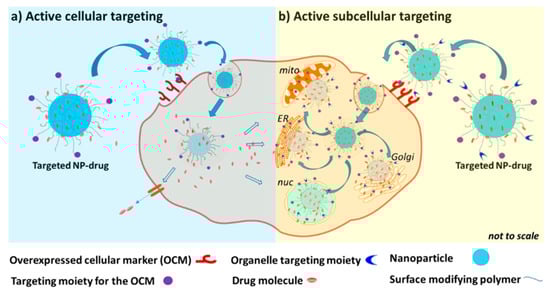 Currently, where do the active targeted NP-drug constructs stand in the clinical trial setting? Most of the currently approved NP-drugs for clinical trials are simple formulations of liposomes or polymeric NPs that are delivered by passive targeting [154]. There are few active cellular-targeted NP-drugs constructs that have entered the clinical trial (e.g., Trial# NCT03774680, NCT02979392) pipeline on ClinicalTrials.gov for treating/diagnosing cancer. For example, cetuximab loaded ethylcellulose polymer (Trial# NCT03774680) that was decorated with somatostatin analog for targeting colon cancer is in Phase 1. However, as of now, none of the subcellular organelle-targeting NP-drugs have reached clinical trials yet. Clearly, more understanding and control over preparations and navigation of targeted NP-drug constructs to the organelles of the disease-affected tissue is highly desired. Overall, such NP-drug constructs are still in infancy, and to reach the clinical trial, many basic science questions will have to be answered even after successful demonstration of their significant advantages over non-targeted preparation.