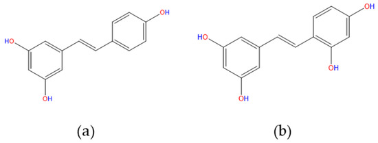 Both resveratrol (trans-3,4′,5-trihydroxystilbene; RES, Figure 1a) and oxyresveratrol (trans-2′,3,4′,5-tetrahydroxystilbene, OXY, Figure 1b) are naturally occurring polyphenolic stilbenes obtained from a variety of plant sources [1]. RES was first isolated from Veratrum grandiflora O. loes [2] and later, has been discovered in several other plants such as peanuts, mulberries, and, Vitis vinifera (grape juice) in high concentrations [3]. Moreover, OXY was isolated naturally from mulberry (Morus Alba L.) and Artocarpus lakoocha Roxburgh (Moraceae) in abundance [4,5].