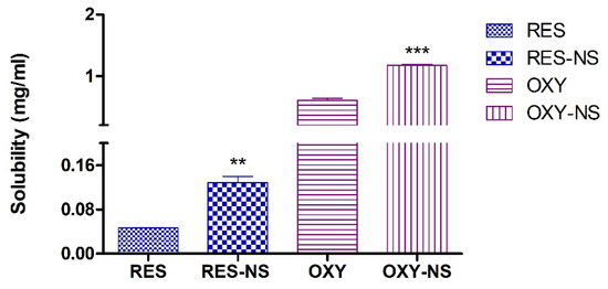 Solubilization of resveratrol (RES) and oxyresveratrol (OXY) in presence of nanosponges (NSs). ** p < 0.001, and *** p < 0.0001 indicates a significant difference between RES vs. RES-NS or OXY vs. OXY-NS.