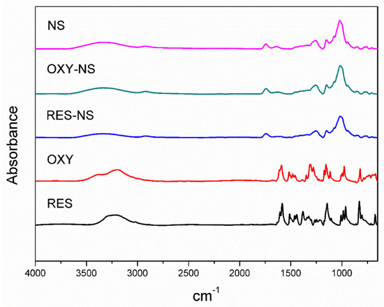 FTIR spectra of RES, OXY, RES-NS, OXY-NS, and blank NS.