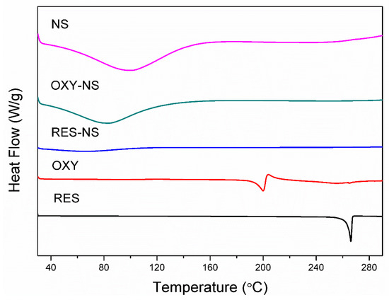 Blank NS was stable and does not undergo any endothermic transition as shown in Figure 5. RES alone showed an endothermic melting peak at 266.49 °C and OXY exhibited endothermic melting at 203.37 °C [39,40]. However, RES-NS and OXY-NS do not show any endothermic melting transitions because of possible encapsulation of RES and OXY within NSs. This endothermic behavior is in agreement with previously reported findings and suggested that the disappearance of endothermic melting could be attributed to the formation of inclusion complex between drugs and NSs [41]. Moreover, the encapsulation of drugs within NSs leads to the amorphization of drug molecules which was further validated by PXRD.