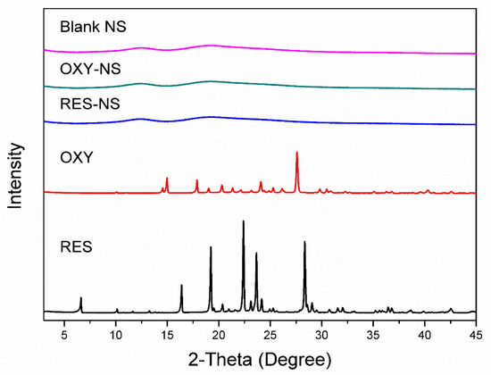 Moreover, OXY also showed the crystalline structure and sharp peaks were observed at a 2θ angle of 14.56, 17.87, 20.30, 21.34, 24.09, and 27.60. The PXRD pattern of both drugs is in agreement with the previous findings [40,42] However, the PXRD pattern of NS alone demonstrated its amorphous nature. RES-NS and OXY-NS do not exhibit any intense peaks in their respective PXRD pattern, which confirmed that both drugs were molecularly dispersed in the amorphous state within the NSs [43].