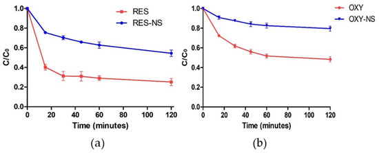Photodegradation study of (a) RES vs. RES-NS and (b) OXY vs. OXY-NS.