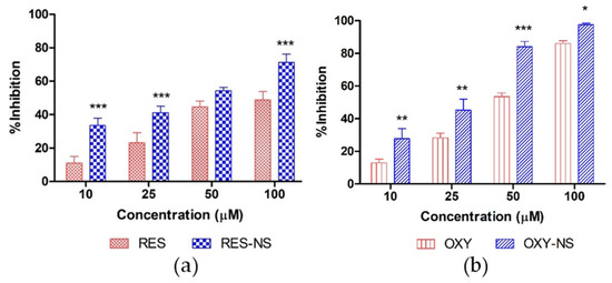 DPPH inhibition activity of (a) RES vs. RES-NS and (b) OXY vs. OXY-NS. * p < 0.05, ** p < 0.01, and *** p < 0.001 indicates a significant difference between RES vs. RES-NS or OXY vs. OXY-NS at the same concentrations, two-way ANOVA, followed Bonferroni correction.