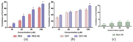 Cell cytotoxicity study of (a) RES vs. RES-NS (b) OXY vs. OXY-NS, and (c) blank NSs after 96 h. * p < 0.05 indicates a significant difference between RES vs. RES-NS or OXY vs. OXY-NS at the same concentrations.