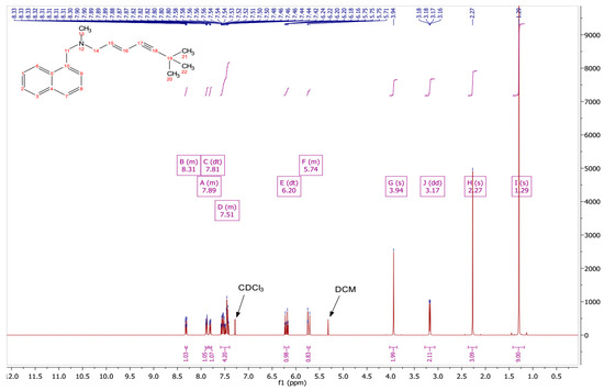 1H NMR (500 MHz, Chloroform-d, δ in ppm) δ 8.34–8.29 (m, 1H, Ar–H), 7.91–7.85 (m, 2H, Ar–H), 7.59–7.40 (m, 4H, Ar–H), 6.20–6.24 (m, 1H, CH2), 5.76–5.70 (m, 1H, CH), 3.94 (s, 2H, N–CH2–Ar), 3.17 (dd, J = 6.6, 2H, CH–CH2–N), 2.27 (s, 3H, N–CH3), 1.29 (s, 9H, 3 × CH3).