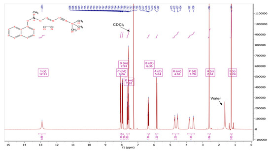 The conversion to the free base was confirmed by comparing experimental 1H NMR data (Figure 1) with the data reported for the 1H NMR analysis of TBF-free base reported in United States Patent Publication No.: US 6,515,181 B2 [28]. In addition, the results for the 1H NMR analysis of the starting material, TBF hydrochloride, are shown in Figure 2, with a singlet peak at 12.91 ppm for the hydrochloride proton, which is absent in the 1H NMR spectrum of the base. The spectral data are as follows: