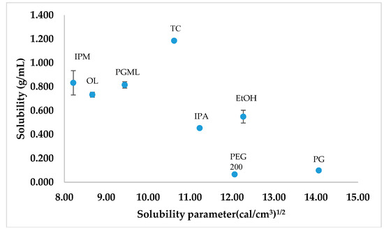 The van Krevelen and Hoftyzer solubility parameters of the various solvents were plotted against their corresponding TBF-free base solubility (Figure 4). The solubility of a solute in the respective solvent has been suggested to be high if the solubility parameter difference between the solute and solvent is low [29,30]. Comparatively higher solubility was observed for TBF-free base in TC, PGML, IPM, OL, and IPA than PG and PEG 200 (p < 0.05), and their solubility parameters were close to the solubility parameter value for TBF, 9.87 (cal/cm3)1/2. The lower solubility of TBF-free base is evident for PEG 200 and PG, consistent with the solubility parameter values of PG, and PEG 200 (14.07 and 12.06 (cal/cm3)1/2) being more distant from TBF. However, TBF-free base showed higher solubility in EtOH (0.55 ± 0.05 g/mL) than PEG 200 (p < 0.05) despite the similarity in solubility parameters for PEG 200 and EtOH (12.27 (cal/cm3)1/2).