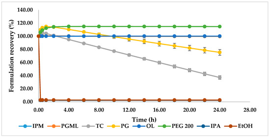 The DVS results of candidate formulations are shown in Figure 5. As expected, the PGML, IPM, and OL systems showed no change in weight during the study as they are non-volatile [19]. However, for TC and PG, considerable evaporation is evident; an initial spike in weight for these formulations reflects the hygroscopic nature of these solvents [31]. The sustained weight increases for PEG 200 also reflects a similar uptake of water over time. The EtOH and IPA formulations showed rapid evaporation after application, and after 15 min the recovery weights were 2.67% and 2.39% respectively.
