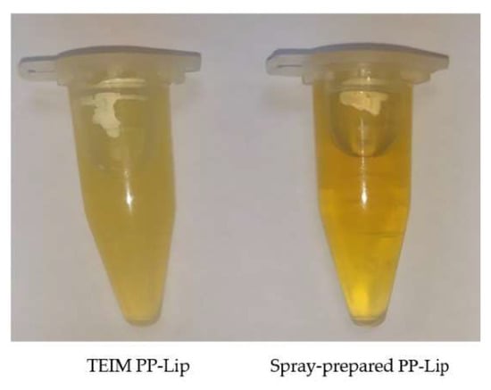 Macroscopic examination of the typical ethanol injection method (TEIM)-prepared and spray-prepared PP-Lip.