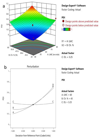 The perturbation and 3D plots of PDI in Figure 3a,b) show that LMC and CH% have strong positive effects on PDI. The PDI increases and the sample becomes more heterogeneous as LMC and CH% increase. On the other hand, the ANOVA test for PDI data supports the suggestion that DL has an insignificant effect on the PDI (Table 4).