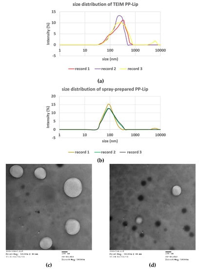Top: particle size distribution of liposomes prepared using (a) TEIM and (b) spray method. Transmission electron microscope (EM) image of the (c) TEIM-prepared and (d) spray-prepared PP-Lip.