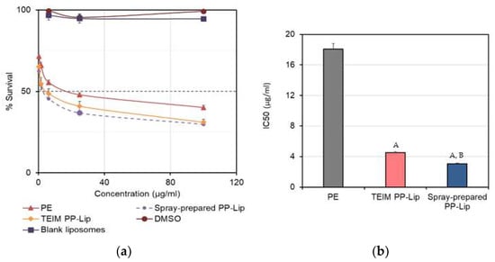 (a) Dose–response curves representing the cytotoxic activity of propolis extract (PE), TEIM-prepared PP-Lip and spray-prepared PP-Lip against A375 human melanoma cells, and (b) IC50 values (μg/mL) of different formulations. Values are average and n = 3. In the bottom figure, A represents a significant difference from PE (p < 0.01), and B means significantly different from TEIM PP-Lip (p < 0.05).