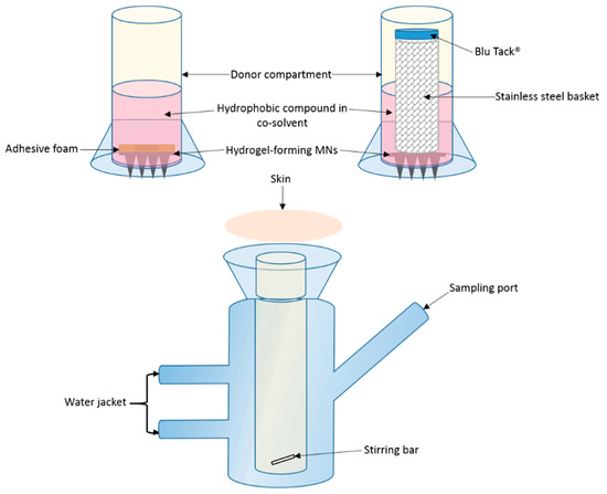 Shaved dermatomed (Integra Life Sciences, Padgett Instruments, NJ, USA) neonatal porcine skin (thickness ~350 µm) was attached to the flat flange of a custom-made Franz cell donor compartment (15 mm orifice diameter, 40 mm height) using cyanoacrylate glue; stratum corneum side orientated upwards. The skin was placed on dental wax to provide support and to facilitate confirmation of MN penetration. MNs were inserted into the skin by applying gentle pressure to a syringe plunger for 30 s, with the flat end pressing on the baseplate. A stainless steel 40 Mesh Mini Basket (Quality Lab Accessories, LLC, Telford, PA, USA) was placed on top of the inserted MNs with Blu Tack® (Bostik Ltd, Stafford, UK) attached to provide a mass of 8 g. Liquid drug formulation (1 mL NR dye in PEG 400, 50 µg/mL) was pipetted into the donor compartment, sealed using ParafilmM® and mounted onto the receiving compartment. Receiving compartment contained 20% v/v PEG 400 in PBS (pH 7.4) stirred continuously at 600 rpm and thermostated at 37 ± 1 °C (Figure 1). Samples (200 µL) were removed at pre-defined time intervals and the receiver fluid replenished with an equivalent volume of degassed, pre-warmed receptor medium. Samples were centrifuged for 5 min at 12,225 g using an Eppendorf Minispin centrifuge (Eppendorf UK Ltd., Stevenage, UK) and then analysed using UV–vis spectroscopy.