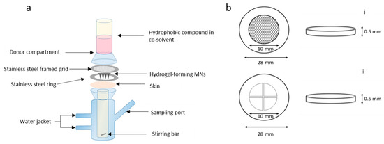 Schematic representation of (a) modified Franz cell setup for in vitro drug permeation with custom-made stainless steel ring and framed grid (not to scale) and (b) stainless steel disk (28 mm outer diameter, 10 mm inner diameter and 0.5 mm thick) with a (i) circular grid and (ii) cross-shaped grid.