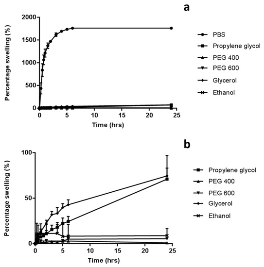 The swelling profiles of hydrogel-forming baseplates in various solvents was investigated with findings presented in Figure 3. PBS (pH 7.4) was chosen as the standard swelling medium, as it is commonly used to represent interstitial fluid in in vitro experiments. In this medium, the percentage swelling of the hydrogel baseplates was 1760 ± 17.8%. In contrast, very limited, if any swelling occurred when baseplates were placed in organic media, with no significant difference found between the solvents (p > 0.05). There was virtually no swelling of the baseplate when immersed in PEG 400 for 24 h (<1%) and limited swelling with propylene glycol (70.9 ± 12.1%).
