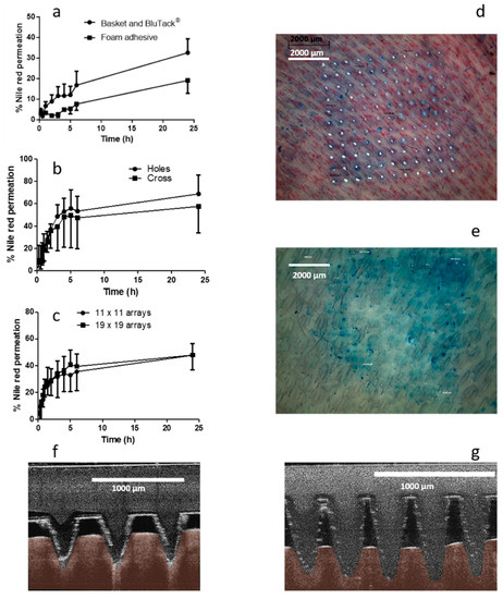 In vitro cumulative permeation profile of Nile red (NR) dissolved in PEG 400 across dermatomed neonatal skin using hydrogel-forming microneedle (MNs), (a) comparing two setups to maintain MNs in situ (means ± S.D., n ≥ 3), (b) comparing two stainless steel-grid setups to maintain MNs in situ (means ± S.D., n ≥ 3), (c) with either 11 × 11 or 19 × 19 dimensions (means ± S.D., n ≥ 3), digital images of methylene blue stained neonatal porcine skin following removal of (d) 11 × 11 and (e) 19 × 19 hydrogel-forming MNs, and optical coherence tomography (OCT) images of full thickness porcine skin immediately post insertion of (f) 11 × 11 (average MN insertion depth: 431.36 µm ± 7.9 µm) and (g) 19 × 19 (average MN insertion depth: 194.88 µm ± 13.81 µm) hydrogel-forming MNs.