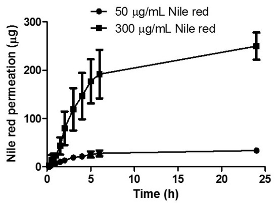 The effect of NR concentration on permeation was assessed by comparing the cumulative permeation profiles obtained following delivery from a reservoir containing 1 mL of 50 μg/mL NR in PEG 400 solution with a reservoir containing 1mL of 300 μg/mL NR in PEG 400 solution (Figure 5). After 24 h, 249.88 μg ± 28.15 μg was delivered from the 300 μg/mL reservoir, while 33.94 μg ± 3.00 μg was delivered from the lower loading reservoir. Increasing the loading by six times, resulted in a respective increase in drug permeation. As apparent from the cumulative percentage permeation profile, there was no significant difference between final NR delivery, with 83.30% ± 9.38% permeated from the higher loaded reservoir and 67.88% ± 6.01% permeated from the lower loaded reservoir (p = 0.20).