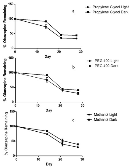 Stability profile of olanzapine over 28 days in solutions of (a) 5% v/v PEG 400 in PBS, (b) 5% v/v propylene glycol in PBS and (c) 5% methanol in PBS (means ± S.D., n = 3).