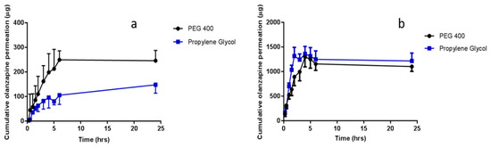 Cumulative in vitro olanzapine (OLP) permeation profile via hydrogel-forming MN arrays in combination with liquid reservoirs dissolved in PEG 400 or propylene glycol at an olanzapine concentration of (a) 0.5 mg/mL or (b) 2.5 mg/mL (means ± S.D., n ≥ 3).