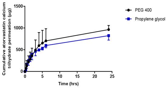 Cumulative in vitro atorvastatin calcium trihydrate (ATR) permeation profile via hydrogel-forming MN arrays in combination with liquid reservoirs containing 2.0 mg/mL atorvastatin calcium trihydrate dissolved in PEG 400 or propylene glycol (means ± S.D., n = 4).