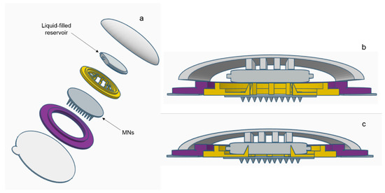 Schematic representation of a suitable device for the amalgamation of hydrogel-forming MNs and a liquid reservoir: (a) an expanded view of the device components and zoomed image of sealed liquid-containing reservoir, (b) the device on skin prior to the application of pressure and (c) the application of pressure with subsequent piercing of reservoir and insertion of MNs.