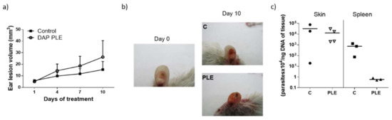 On the other hand, in the ear model, treatment with DAP–PLE was started when lesion sizes reached 5 mm3 (Figure 5a,b). At day 10, treatment was stopped as the volume in PLE-treated ears was 2.6-fold higher than in the control (24 mm3 vs. 9 mm3, respectively). Moreover, skin irritation, peeling, and hair loss were found in mice treated with DAP–PLE (Figure 5b). Parasite burden quantified in skin was similar to that in the control. However, parasites quantified in spleen were also reduced, as in the tail model (Figure 5c).