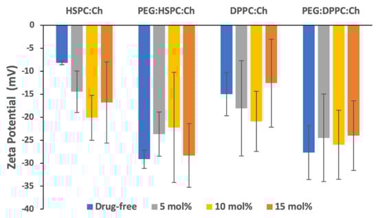 PEGylation of DS-free liposomes resulted in a significant increase (p < 0.05) in the negativity of zeta potential for both phospholipids. However, despite the apparent differences in ZP values between PEGylated and non-PEGylated DS-liposomes, no statistically significant differences amongst DS-loaded liposomes were found. Nevertheless, this might suggest that ZP values might be affected by vesicle size [38].